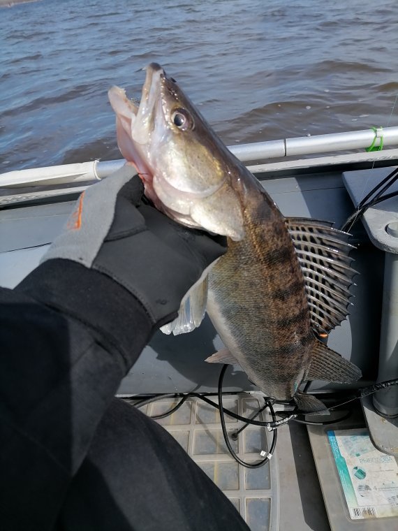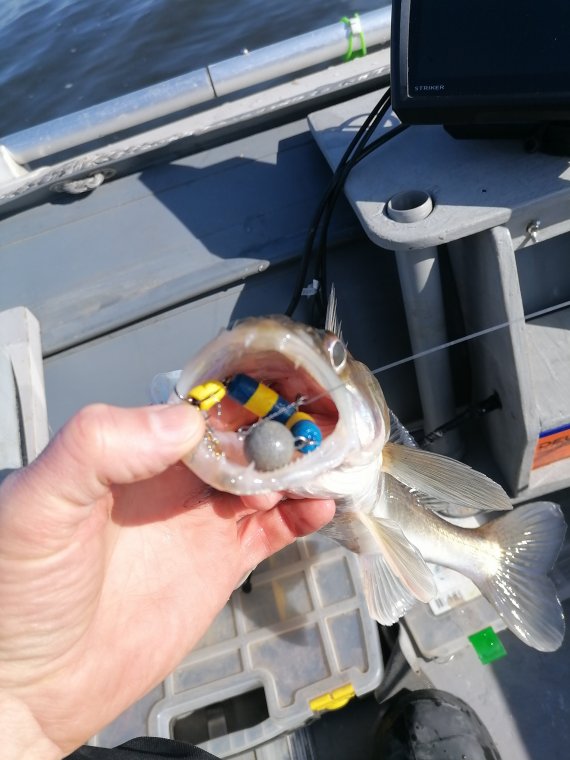 Сегодня вообще рыбалка могла быть пролетной.На воде сломалась струбцина от датчика эхолота.Но кое как приспособил и рыбачил.Ловил на Василях.Вода такой же мутняк.Рыбы на глубине,где в прошлом году ловили практически нет.Ну и рыбаков то же не особо много.Стал искать новые места,но с такой струбциной толком не порыбачишь,чуть газ прибавишь-отваливается.Ну и в конце концов нашел место,где много всякой рыбы стояло.Рыбы много,но надо еще ее умудрится поймать.Всякие приманки в течении дня перепробовал.И мандулу и мелкий силикон и крупный.В итоге на медленной проводке клюнул на FAT 6.8 на 22 гр джиг головке.Потом еще пробовал ловить,но опять датчик не держится,побоялся его раздолбать и поехал домой.Главное понял где рыба стоит и на какие приманки ловить в таких условиях.Ну и до запрета еще пару раз сбираемся с Владом на рыбалку.