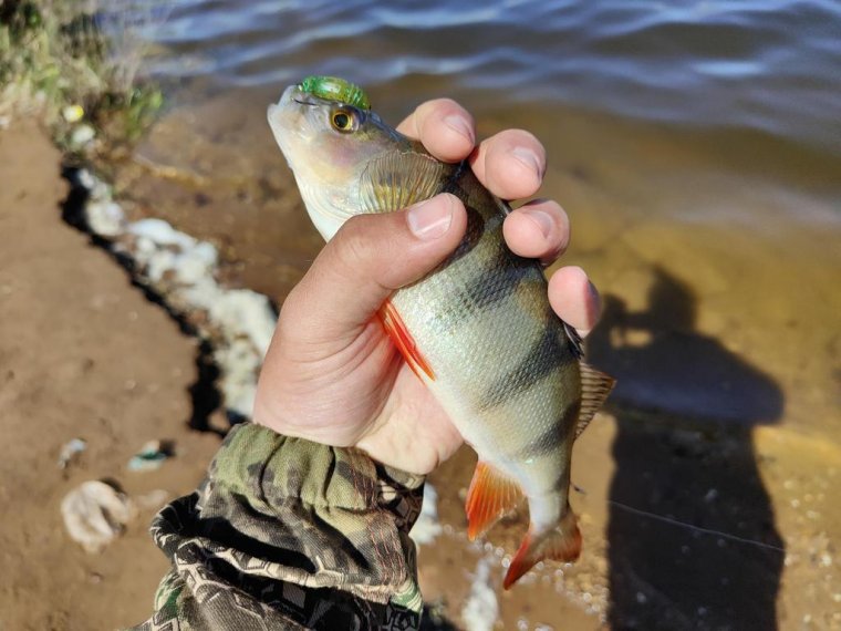 и сегодня работает приманка в черном цвете с белыми крапинками под больную рыбку. Первую точку выбрали пляж и не прогадали, Вова поймал сразу три окуня и окуня опять зачётные, сегодня мы решили их забирать, самое то на засолку да и пожарить таких можно.