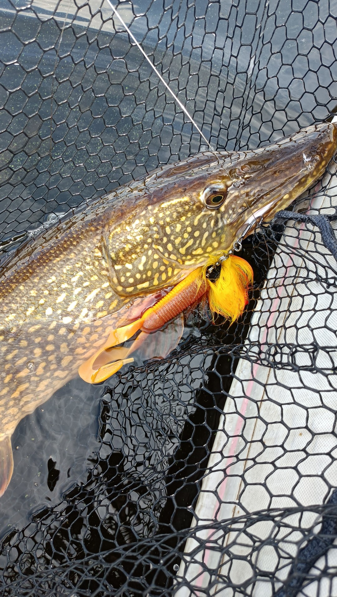 Первая щука примерно на пятак клюнула у Влада на ФАТ 7,8 на 10 гр. джиг-головке