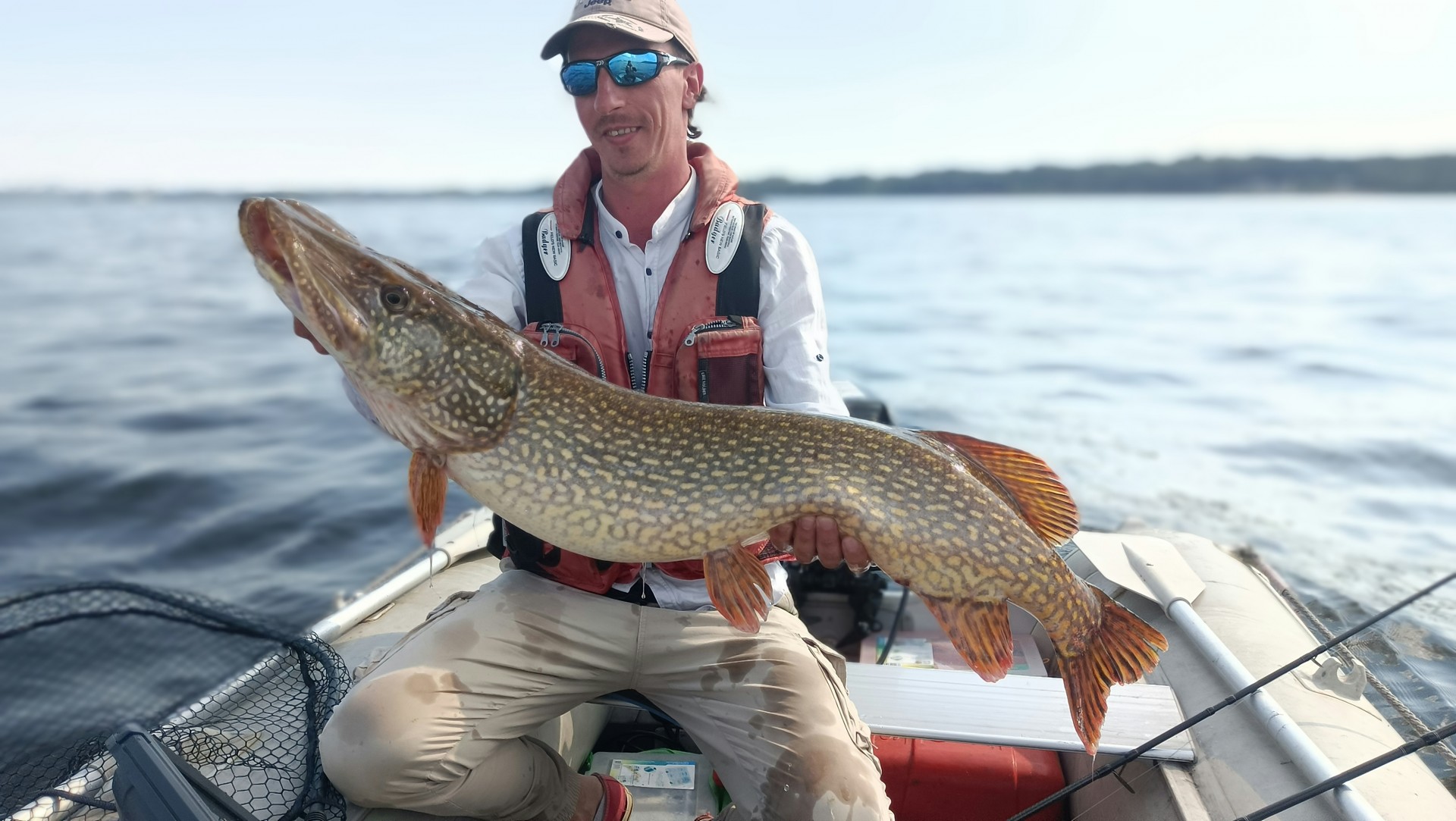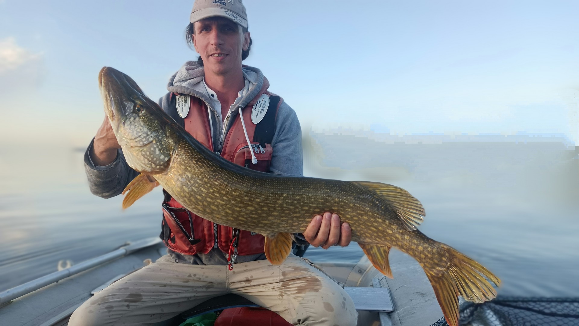 Утром не стали заморачиваться с судаком и сразу рванули за щукой.Когда пришли на место картина в эхолоте была не особо обнадеживающая.Но решили сделать несколько забросов.Обычно,если правильно встали на точку,то щука клюет на первой же проводке(конечно же если это проверенные приманки).Влад забрасывает фанкишад 6,9 пал 06 и у него клюет щука под пятак,я уже готов был принять рыбу в подсак,но почти у лодки щука сошла,хотя по мимо джиг головки стоял дополнительный тройник.Настроение конечно же упало,но продолжили ловить.Прошлись по провереным точкам,но рыба была не активная.Но одна щука не отличила кормовую рыбу от все того же фанки шад 6,9 и предстала на фотосессию