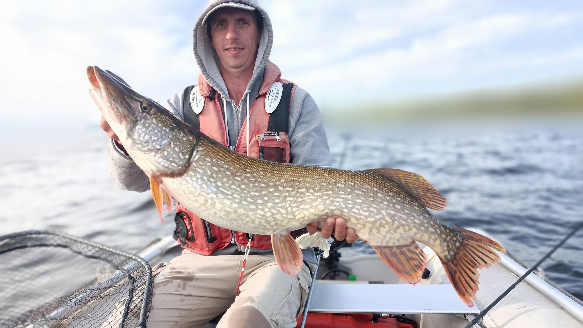 Когда пришли за щукой она уже нас ждала.Увидели хороший силуэт в эхолоте .Я кидаю keitech fat 7,8 и на первом же забросе подсекаю крупную щуку,но она сошла.Настроение сразу упало,но продолжили поиск.Практически сразу Влад находит щуку и кидает ей мышь.Щука с жадностью накинулась на мышь и спустя несколько минут оказалась в лодке на фотосессии.