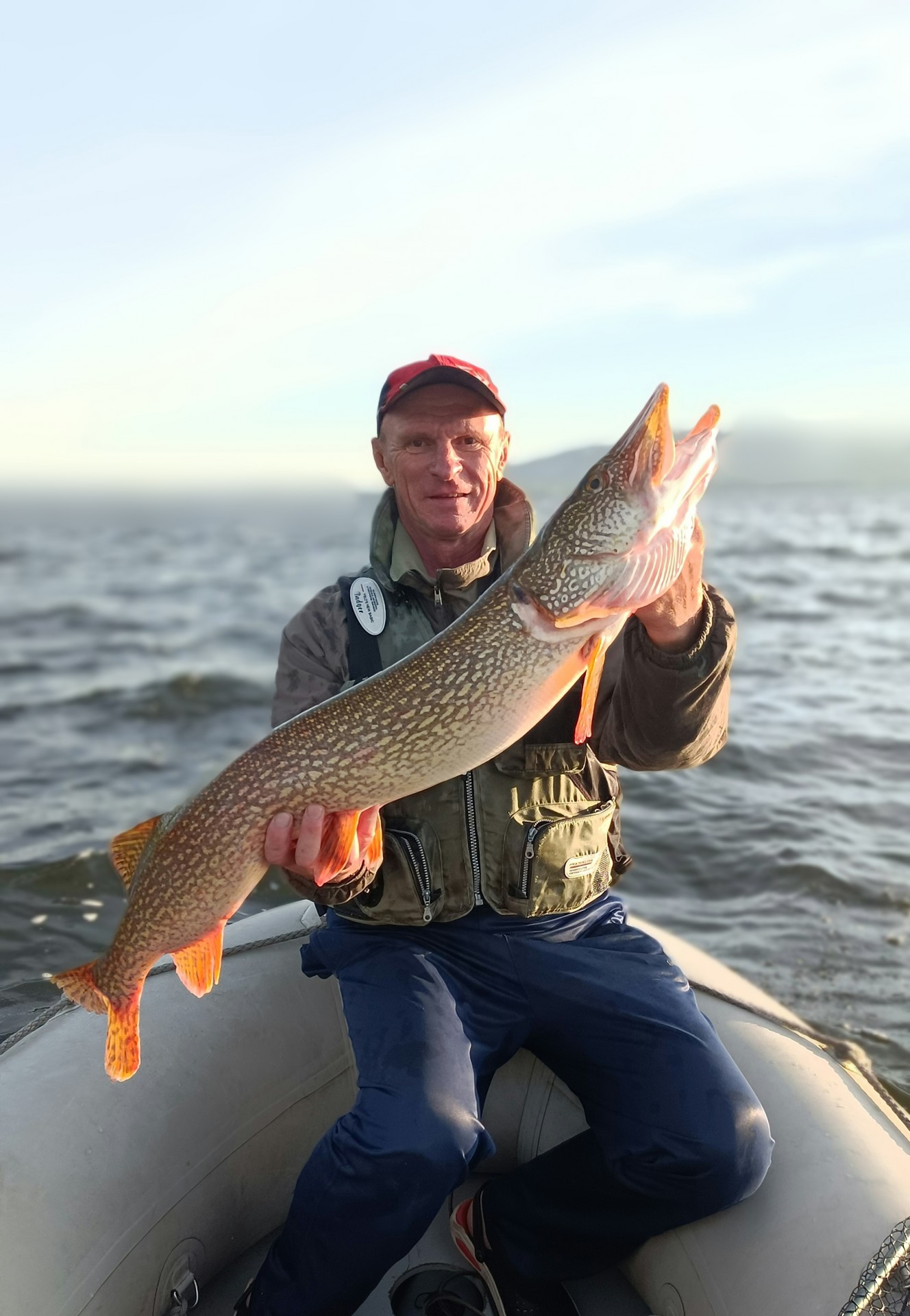 Потом много искали,но ничего нашли.Ну и примерно в обед ,опять на первом же забросе на fat 6.8 ловится трофейная щука десятка.Борьба с рыбой была долгой и напряженной,но в этот раз подняли рыбу на лодку ,сфоткались с бабушкой и отпустили.