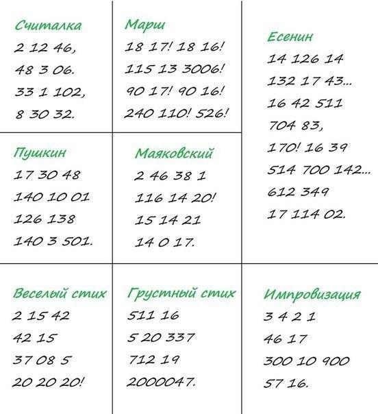 . В подтверждение этой темы предлагаю вашему вниманию так называемые цифровые стихи, где вместо слов используются цифры. И они весьма созвучны стихам поэтов