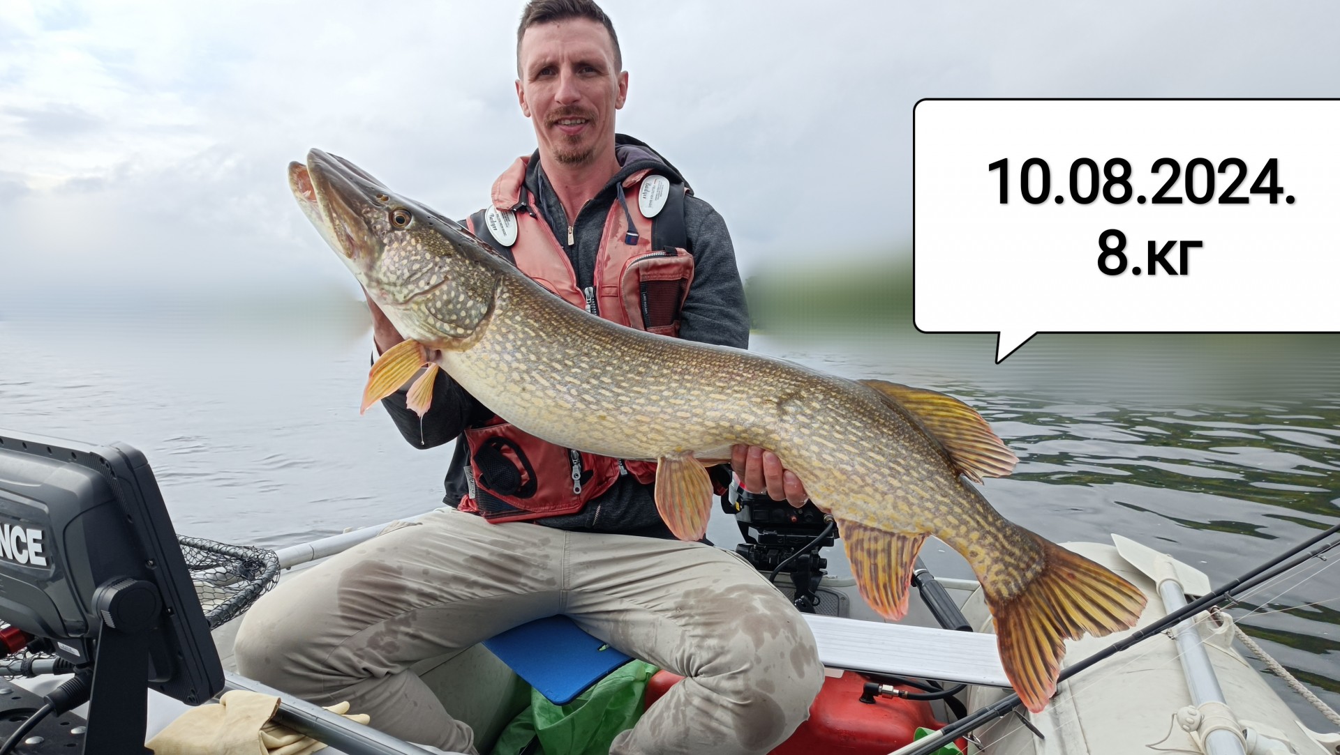 .Потом много ходили искали,кидали приманки,но ни потычки.Ну и на одной постановке у меня на мышку клюет хорошая щука.Щука пошла вверх,против течения.Чтобы рыба не перекрутила плетенку через якорь я передал спиннинг с рыбой Владу,а сам поднял якорь и работал на подсаке.Эта щука на 8 кг. вообще жару дала,не хотела к нам никак на фотосессию,носилась и металась как бешеная,но все таки мы сфоткались с ней и отпустили.