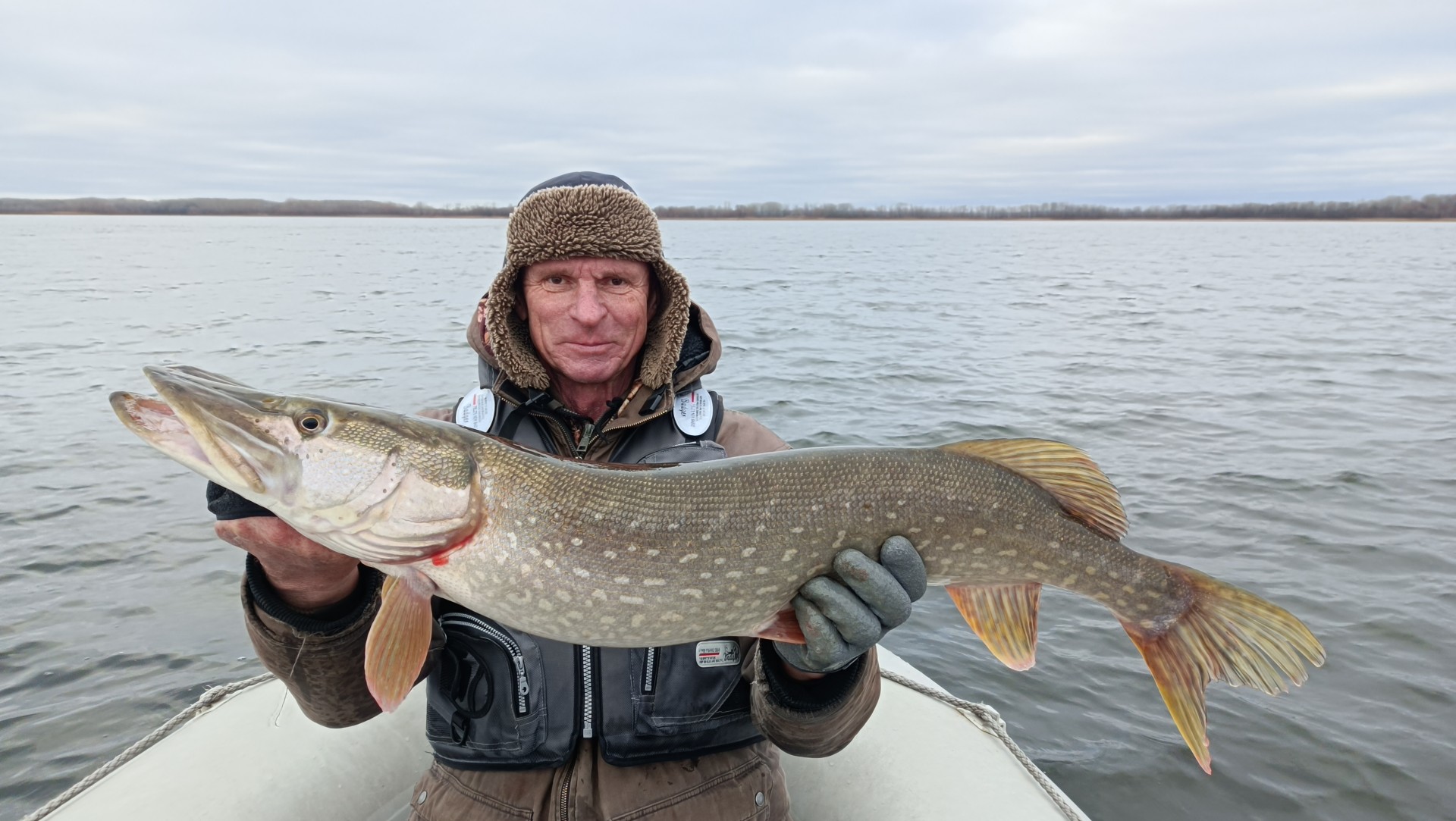 На прошлых рыбалках мы заметили,что щука поздней осенью с утра не очень активна и лучше берёт днём,поэтому выехали чуть позже обычного и утром начали ловить не с самых лучших мест,а поискали щуку на новом для нас месте.К сожалению рыбу там не обнаружили и пошли ловить по своим местам. Рыбаков на воде уже не так много как летом,но на первом же нашем месте стояла лодка.Немного покрутились в этом районе.В этом месте щука не стояла на месте и видно было в экран эхолота,как она довольно быстро перемещается и гоняться за такой рыбой не было смысла.Потом мы постепенно стали приближаться к основным местам.Щуку нашли,но чуть меньше чем на прошлой неделе.Ну и активность щуки снизилась.Смотришь в эхолот,щука вылетает,думаешь сейчас возьмёт,но в итоге легкие кусания приманки за хвост.Но в итоге 2-e самые большие щуки клюнули у Влада ,как и полагается на большую приманку мышь MiurasMouse Big.