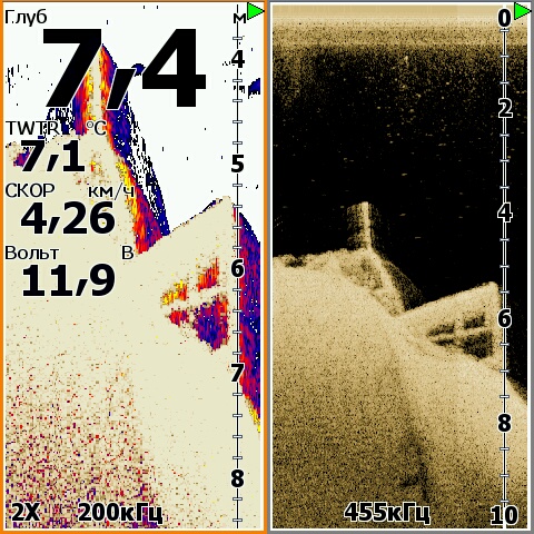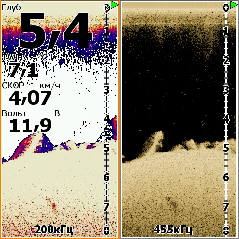 Очень сильно различаются картинки стайной рыбы на сонаре и DSI. Просто "небо и земля".